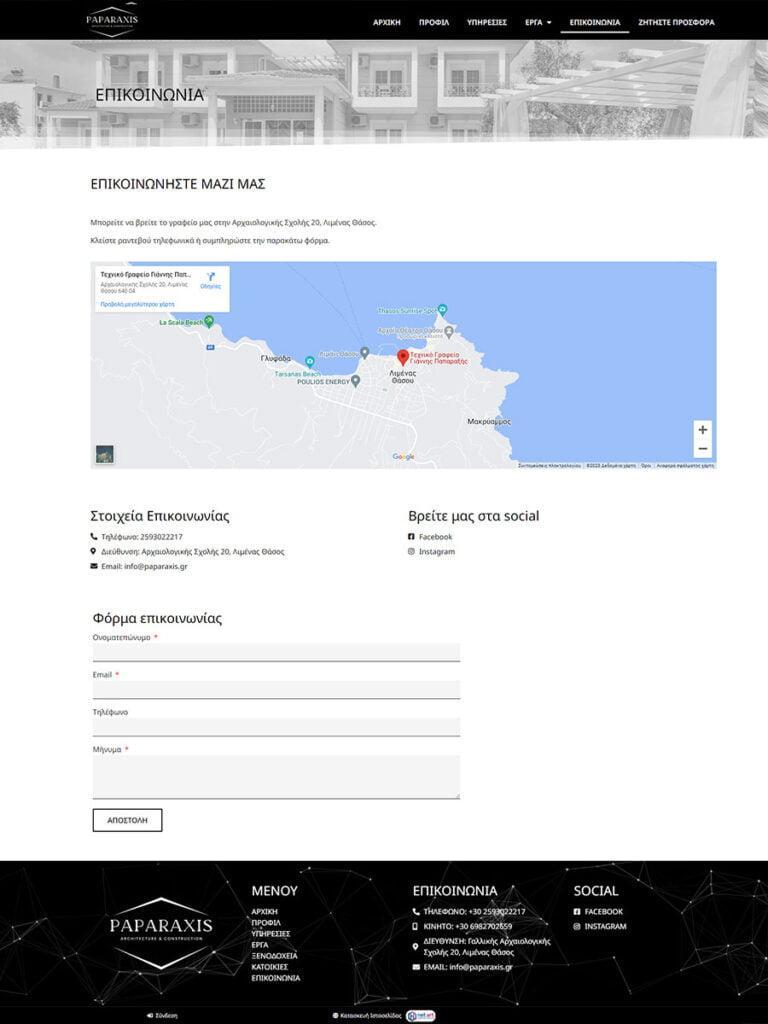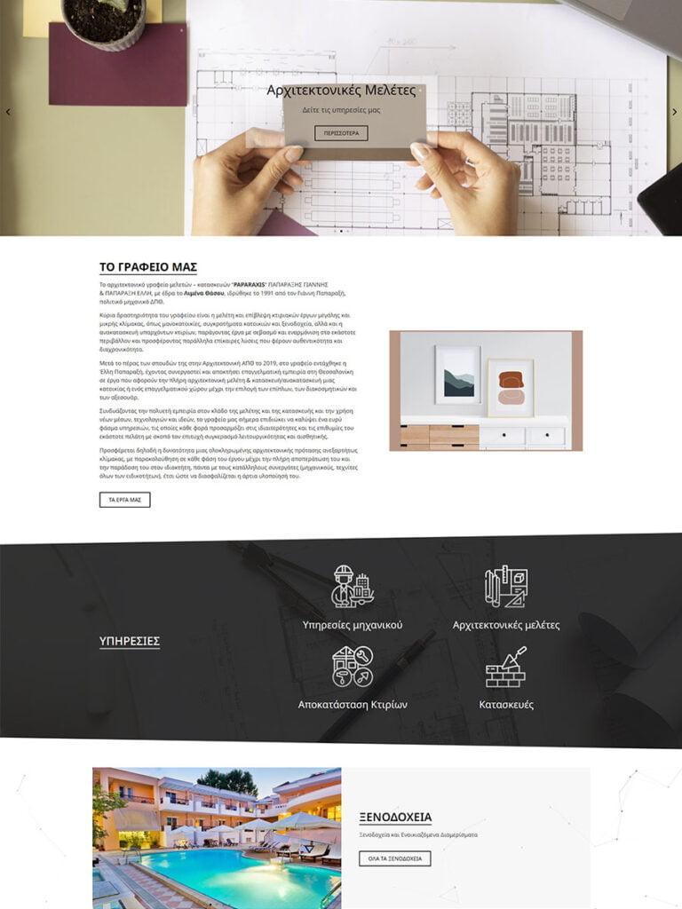 Κατασκευή ιστοσελίδας για Αρχιτεκτονικό γραφείο με έδρα το Λιμένα Θάσου. Έγινε επαγγελματική μινιμαλιστική σχεδίαση και παρουσίαση των υπηρεσιών και των έργων. Δόθηκε έμφαση στην σωστή σχεδίαση στα κινητά καθώς και στην ταχύτητα. Η σχεδίαση έγινε στη Νο1 πλατφόρμα παγκοσμίως, το wordpress και δόθηκε έμφαση στη σωστή εμφάνιση σε όλες τις συσκευές καθώς και στην ευκολία περιήγησης.