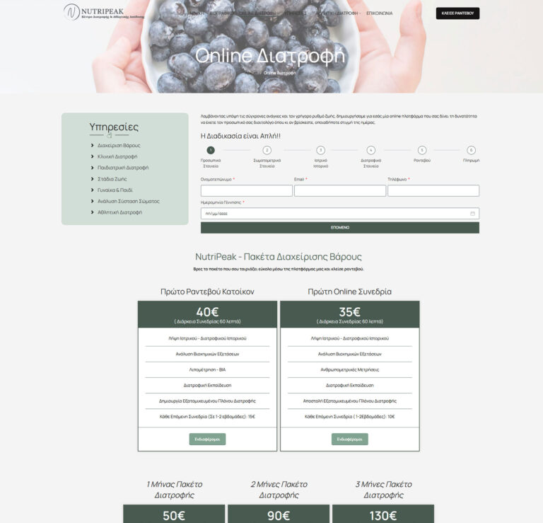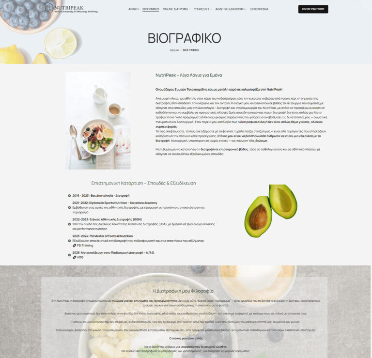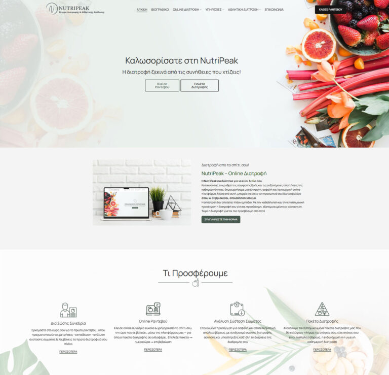 Κατασκευή ιστοσελίδας για τη NutriPeak. Έγινε επαγγελματική σχεδίαση και αναλυτική παρουσίαση υπηρεσιών διατροφής.