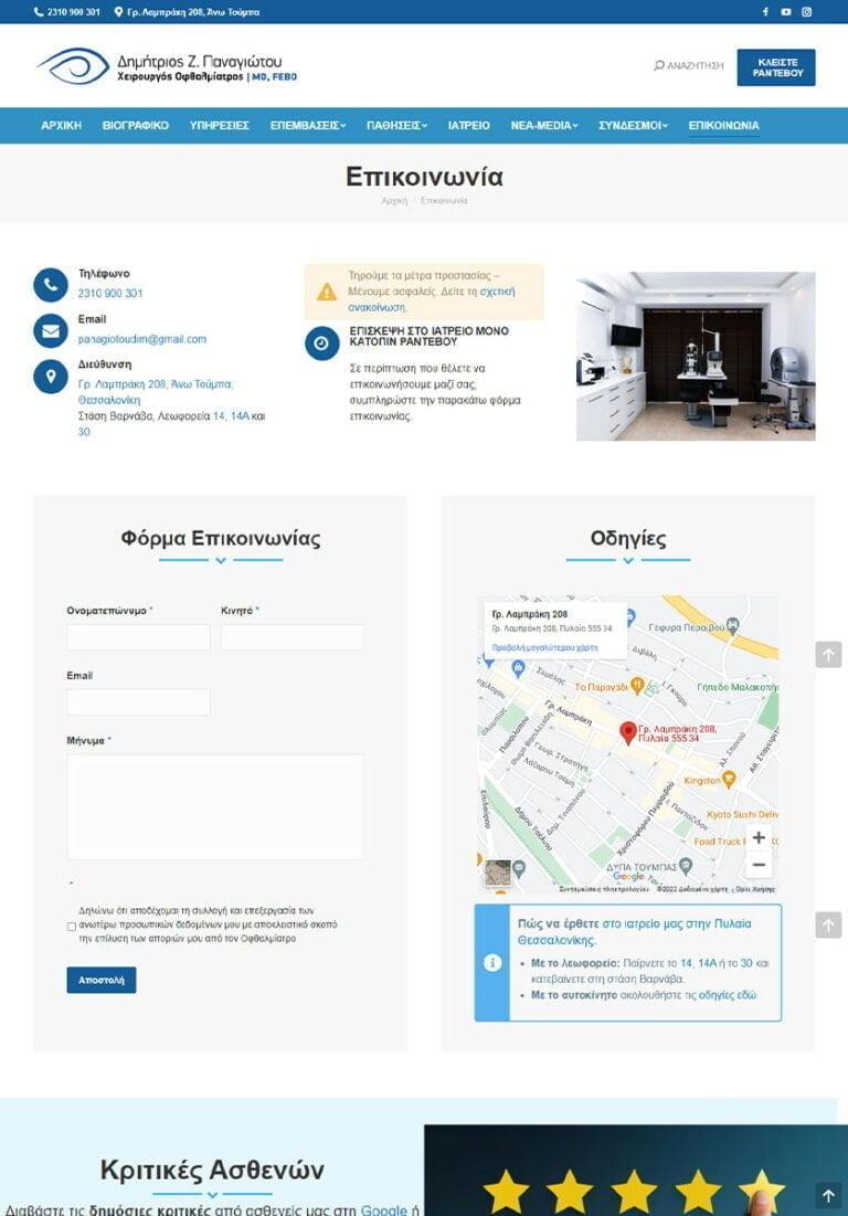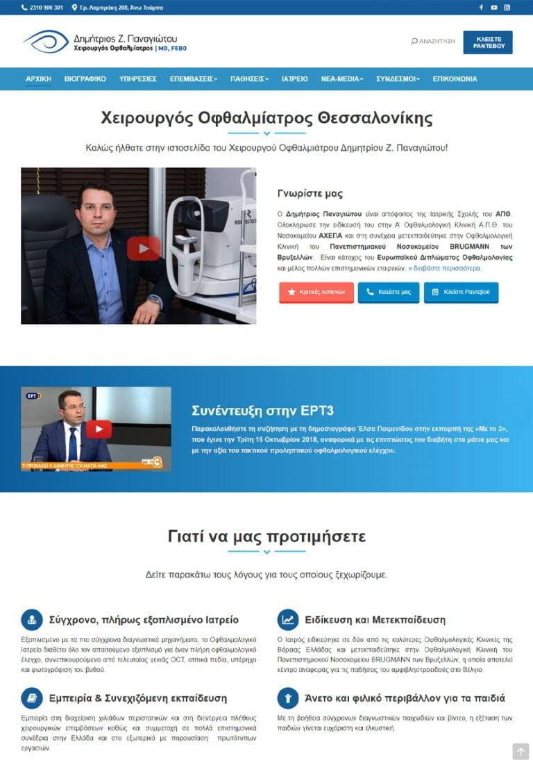 Κατασκευή ιστοσελίδας σε χειρουργό οφθλαμίατρο στη Θεσσαλονίκη. Η σχεδίαση έγινε στη Νο1 πλατφόρμα παγκοσμίως, το wordpress και δόθηκε έμφαση στη σωστή εμφάνιση της ιστοσελίδας. Διαθέτει online φόρμα ραντεβού και παρέχεται οργανωμένη παρουσίαση των υπηρεσιών.